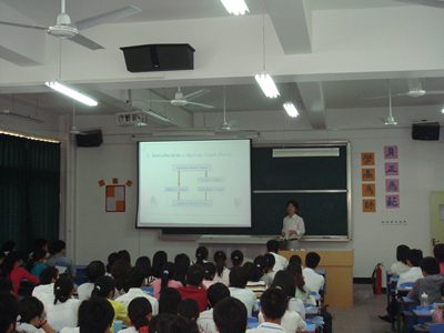 范益政教授的报告紧紧把握代数图论研究领域的前沿动态,用生动精致的多媒体课件直观展示了代数图论研究领域的几个问题,图文并茂,内容丰富。范教授的报告围绕图与特征值、色数与特征值、圈空间与割空间三个方面展开。他生动的语言、渊博的知识、严谨的治学态度深深地感染了每一位听众。现场的气氛十分热烈,精彩的学术报告赢得了全场师生的阵阵掌声。