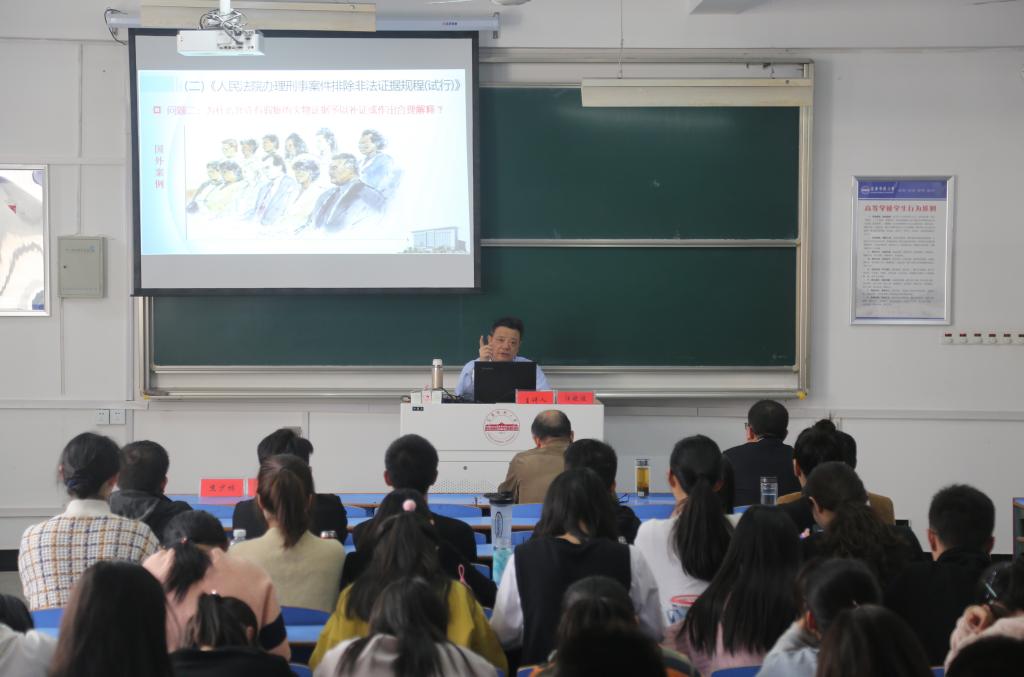 汪院长从自身丰富的法律职业经历谈起,讲述了自己工作以来的经验体会,指出法律工作者对刑事案件证据的正确运用应具有严谨的态度,准确把握司法改革方向并立场坚定。他主要从以审判为中心的刑事诉讼制度改革、“三项规程”、从审判的视角分析刑事案件证据运用的特点及经验教训等维度深入论述刑事案件的证据运用问题。他指出,在以审判为中心的刑事司法改革的推进过程中,刑事审判工作更需注重刑事证据的正确适用。为了深人推进庭审实质化,最高人民法院发布并全面推行“三项规程”,以推进以审判为中心的刑事诉讼制度改革成果在刑事审判活动中的贯彻落实。报告过程中,汪院长结合“辛普森案”、“章莹颖案”和“断趾疑案”等诸多中外典型案例,特别是自己办理的安庆本地的典型案例,细致分析了证据运用问题,充分阐明在刑事案件中正确运用证据的重要性。全体师生认真聆听报告,并纷纷表示获益匪浅。