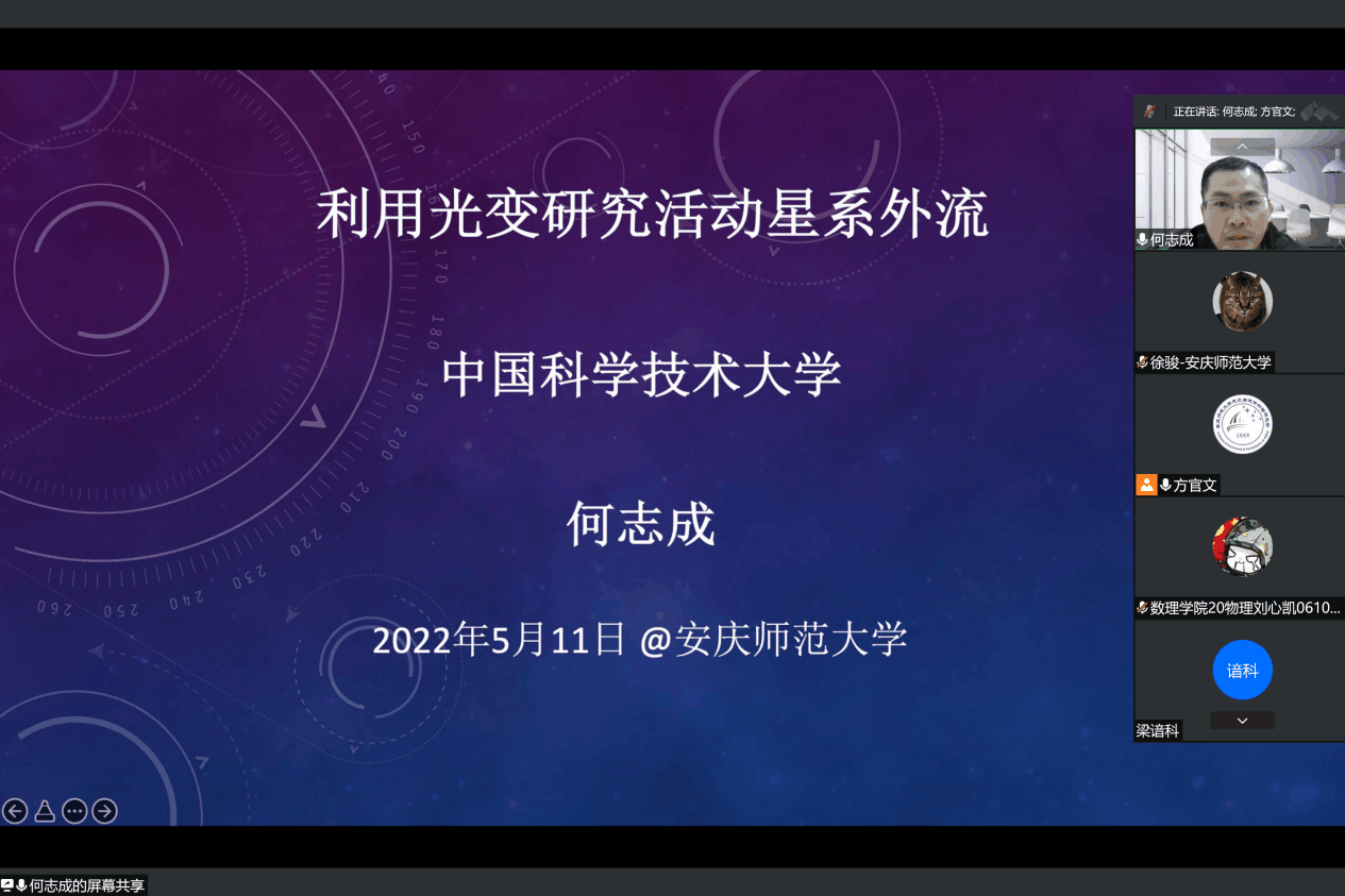 5月11日晚,中国科学技术大学副研究员何志成博士应数理学院及beat365大学生天文爱好者协会邀请作了一场题为“利用光变研究活动星系外流”的线上学术报告。数理学院物理系师生和beat365大学生天文爱好者协会成员参加了本次报告会,报告会由方官文研究员主持。