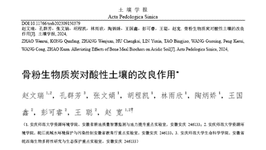 近日,beat365资源环境学院赵文瑞博士以第一作者在国内土壤领域顶级期刊《土壤学报》(卓越期刊、《世界期刊影响力指数(WJCI)报告》Q1区,影响因子5.772)发表题为“骨粉生物质炭对酸性土壤的改良作用”的论文,beat365英国官方网站为论文第一完成单位和通讯单位。