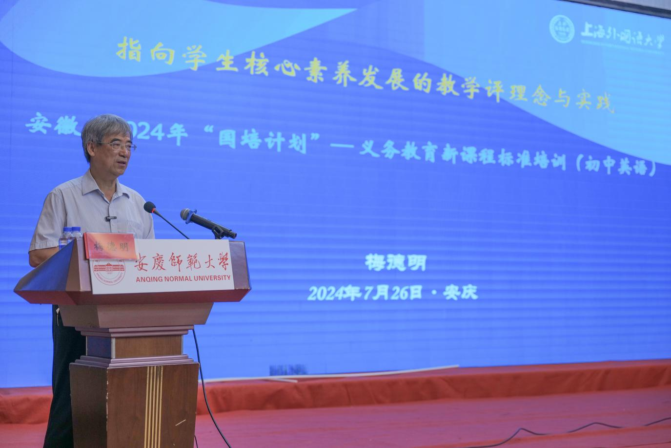 7月26日,教育部义务教育英语课程标准修订组组长、上海外国语大学梅德明教授应邀出席外国语学院承办的安徽省2024年“国培计划”中西部项目-义务教育新课程标准培训(初中 外语)开班仪式,并作题为《指向学生核心素养发展的教学评理念与实践》的主旨报告。外国语学院部分教师和来自安徽省各地市300名初中英语骨干教师聆听了报告。报告由外国语学院院长、该国培项目首席专家王先荣主持。