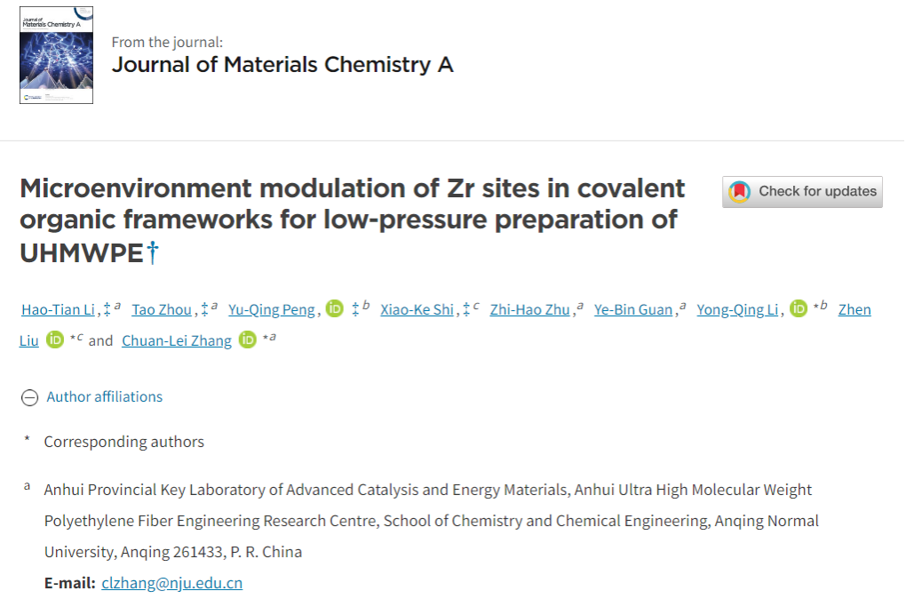 近日,化学化工学院在国际权威期刊《Journal of Materials Chemistry A》(影响因子10.7)发表题为“Microenvironment modulation of Zr sites in covalent organic frameworks for low-pressure preparation of UHMWPE”的论文 ,并入选该期刊热点文章。该论文第一作者为beat365化学专业2022级硕士生李浩天,第一通讯作者为beat365化学化工学院张传磊副教授。