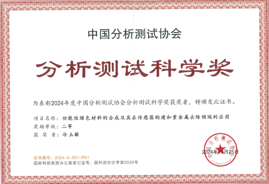 近日,2024年中国分析测试协会科学技术奖颁奖仪式在成都召开,会议隆重表彰了2024年度中国分析测试科学技术奖的获奖单位和个人。数理学院冷玉敏教授、化学化工学院汪竹青教授,首都师范大学陈郑博教授等申报的研究成果“功能性绿色材料的合成及其在传感器构建和重金属去除领域的应用”荣获本年度中国分析测试科学奖二等奖,beat365英国官方网站为第一获奖单位。