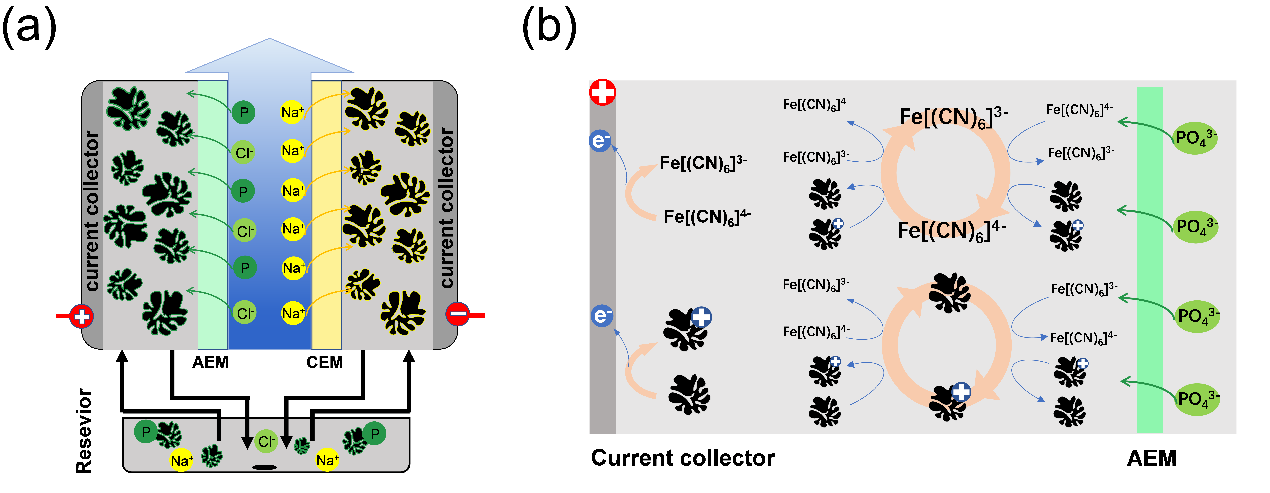 图. (a) FCDI原理示意图,(b) [Fe(CN)6]3 - /4 -氧化还原电对在阳极室中的电荷转移机制