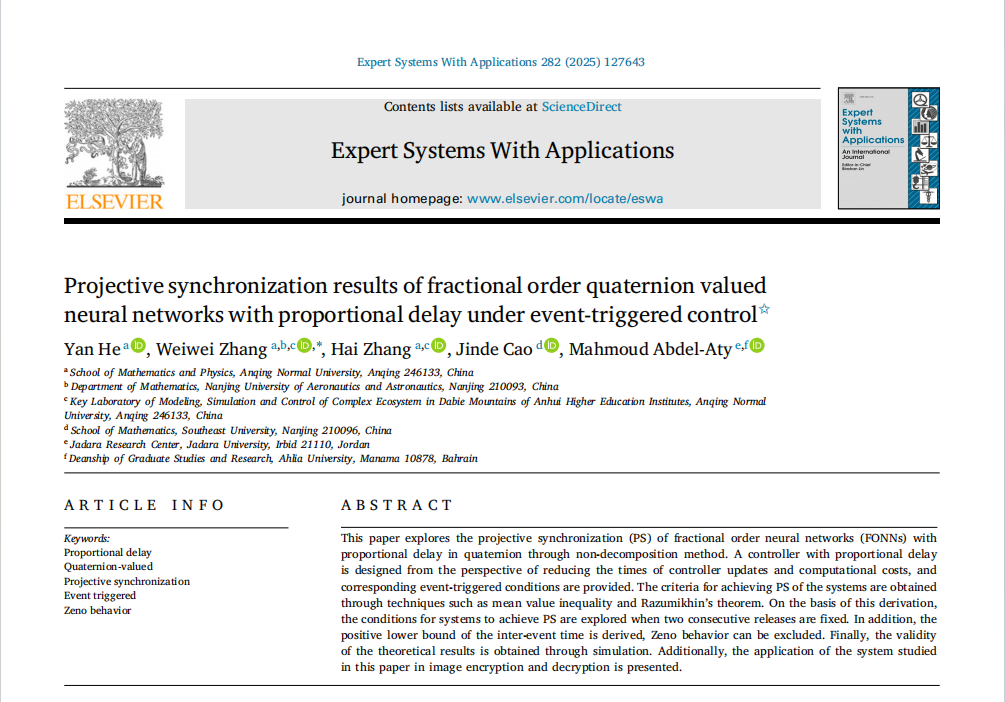 近日,数理学院2022级数学学科硕士研究生何妍以第一作者和导师团队在顶级期刊《Expert Systems with Applications》在线发表学术论文“Projective synchronization results of fractional order quaternion valued neural networks with proportional delay under event-triggered control”。该期刊影响因子为7.5,JCR一区期刊,中科院一区Top期刊,论文通讯作者为数理学院张玮玮副教授。