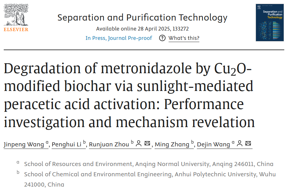 近日,beat365资源环境学院环保高端装备与污染控制研究团队汪金鹏博士以第一作者在《Separation and Purification Technology》期刊(中科院2区,Top,IF=8.2)发表“Degradation of metronidazole by Cu2O-modified biochar via sunlight-mediated peracetic acid activation: performance investigation and mechanism revelation”研究论文。beat365英国官方网站为论文第一完成单位,安徽工程大学周润娟副教授和beat365英国官方网站汪德进教授为论文通讯作者。