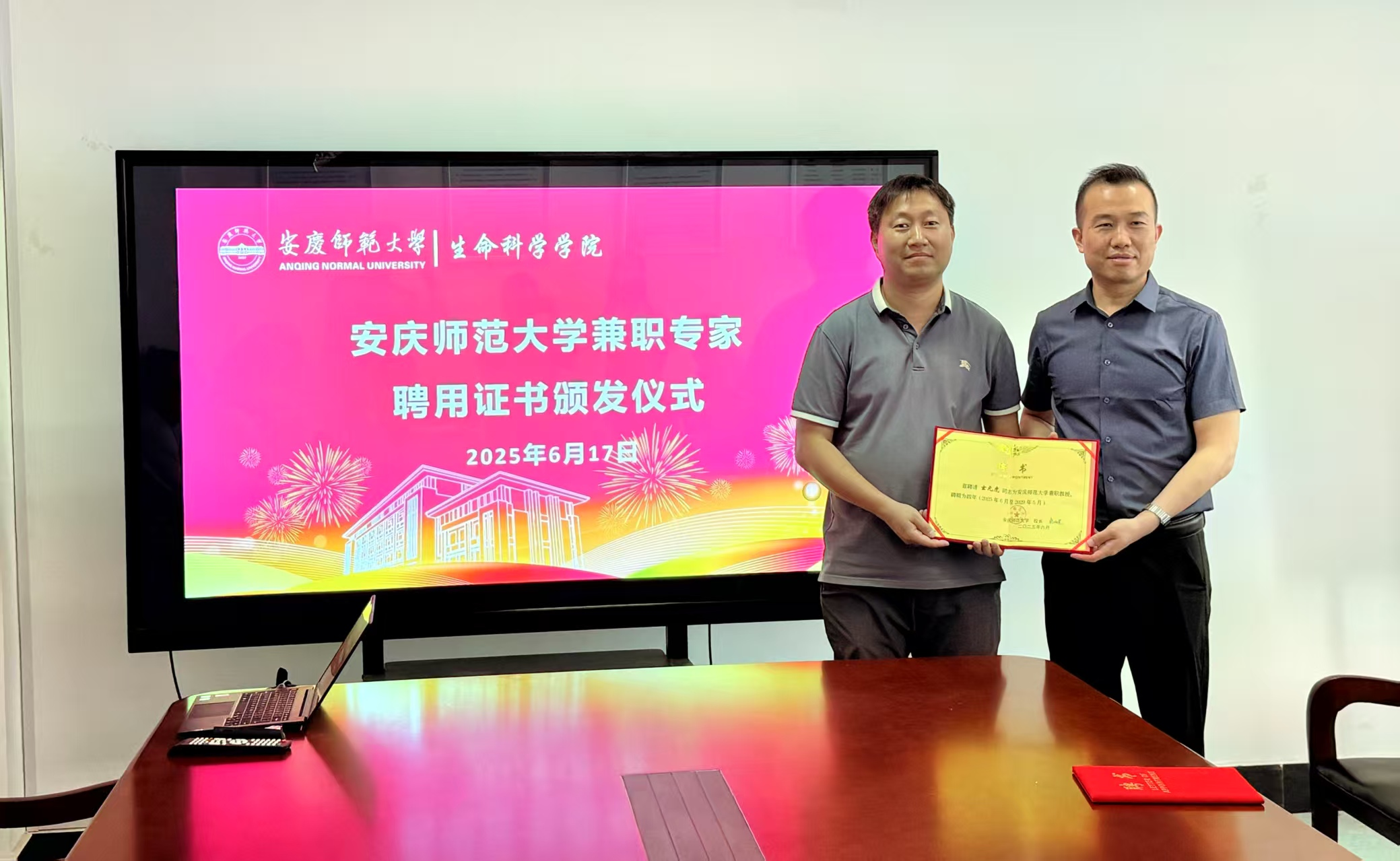 报告会后,生命科学学院举办了beat365英国官方网站兼职专家聘用证书颁发仪式,由吴彦院长主持,聘请玄元虎同志为beat365英国官方网站兼职教授。