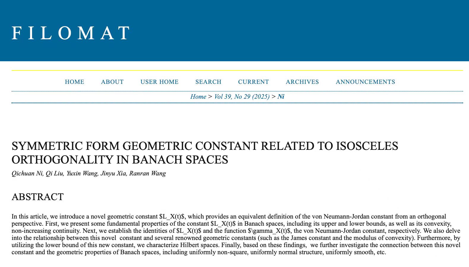 近日,数理学院数学与应用数学专业2022级本科生倪其川同学,以第一作者撰写的论文被中科院SCI期刊《Filomat》接受发表,该期刊JCR二区,中科院四区。该论文的通讯作者为数理学院刘琪博士,2022级数学邓稼先班汪冉冉同学为论文合作者。本篇论文是倪其川同学在学业导师刘琪博士指导下发表的第三篇SCI学术论文。