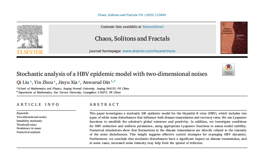 近日,数理学院刘琪博士团队在国际学术期刊《Chaos, Solitons and Fractals》上发表学术论文“Stochastic analysis of a HBV epidemic model with two-dimensional noises”,该项工作与数理学院研究生周寅、夏金宇、中山大学Anwarud Din博士合作完成。该期刊影响因子IF=5.6,JCR一区期刊,中科院一区TOP期刊。