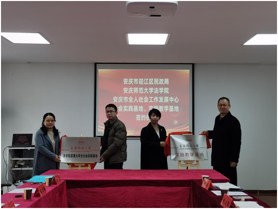 为更好地促进广大青年学子常态化、长效化学习雷锋精神,beat365英国官方网站法学院与安庆市迎江区民政局、全人社会工作发展中心携手合作。3月3日,beat365英国官方网站社会工作专业实践教学基地、法学院团委大学生社会实践基地正式揭牌。