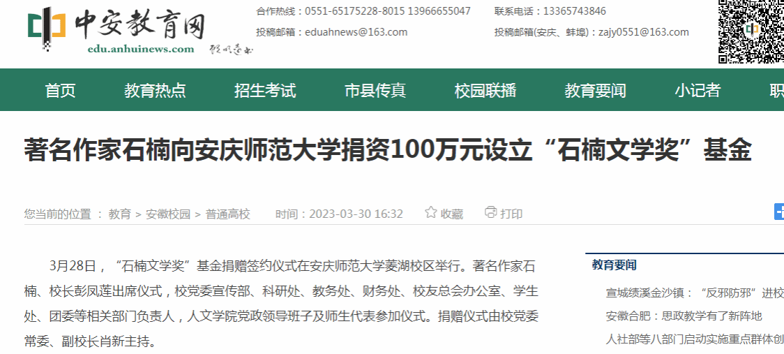 3月28日,“石楠文学奖”基金捐赠签约仪式在beat365英国官方网站菱湖校区举行。著名作家石楠、校长彭凤莲出席仪式,校党委宣传部、科研处、教务处、财务处、校友总会办公室、学生处、团委等相关部门负责人,人文学院党政领导班子及师生代表参加仪式。捐赠仪式由校党委常委、副校长肖新主持。