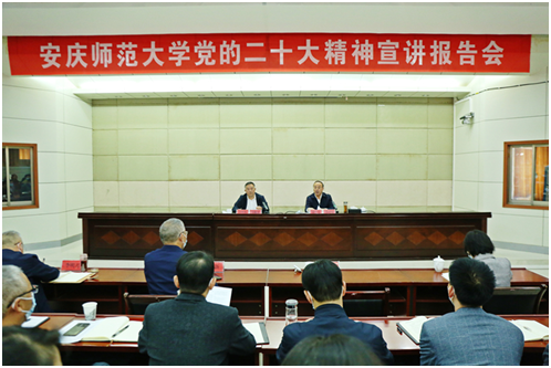 专家专题讲。学校先后邀请党的二十大代表、安庆市委书记张祥安,党的二十大代表、省级巡讲团成员、安徽师范大学马克思主义学院路丙辉教授,省级巡讲团成员、省委讲师团高端宣讲专家、安徽农业大学黄洪雷教授,省级巡讲团成员、省政协文化文史和学习委员会副主任王先俊教授,中共安徽省委党校(安徽行政学院)马克思主义学院副院长郝永华来校宣讲党的二十大精神,对党的二十大召开的历史背景、重大意义及提出的重要思想、重要观点、重大战略、重大举措作了全面系统的阐述和讲解。进一步加深了全校师生对党的二十大精神的理解,进一步激发了全校师生学习宣传贯彻党的二十大精神的热情,进一步提振了全校师生干事创业的精气神。