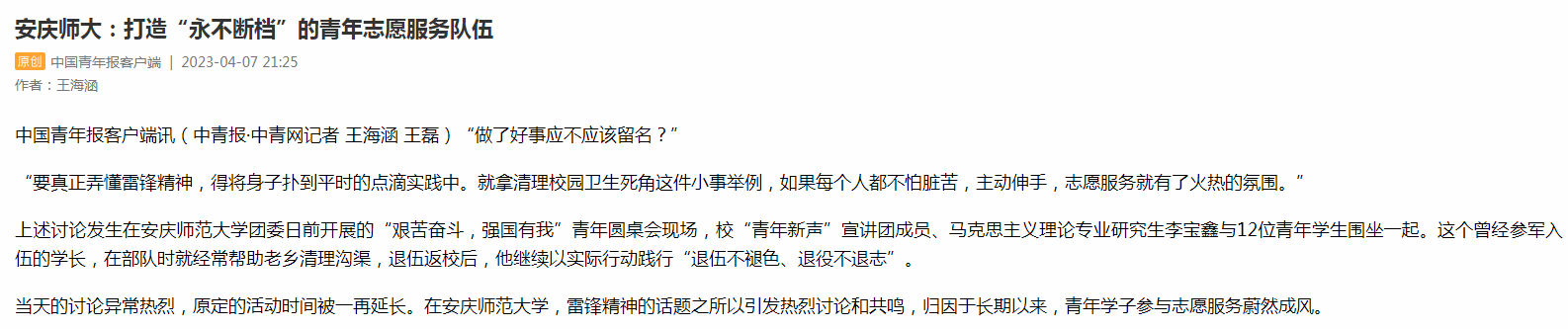 上述讨论发生在beat365英国官方网站团委日前开展的“艰苦奋斗,强国有我”青年圆桌会现场,校“青年新声”宣讲团成员、马克思主义理论专业研究生李宝鑫与12位青年学生围坐一起。这个曾经参军入伍的学长,在部队时就经常帮助老乡清理沟渠,退伍返校后,他继续以实际行动践行“退伍不褪色、退役不退志”。