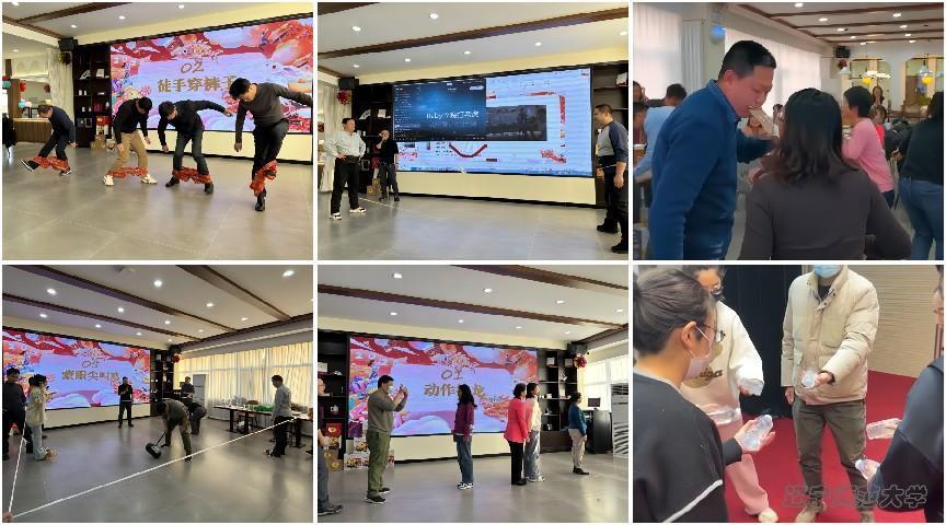 联欢会上,学院教工分成了“龙凤呈祥"、“龙马精神"、“龙飞凤舞"、“龙腾虎跃"四个小组进入了最为精彩的是游戏环节。动作接龙、徒手穿裤子、光盘拔河、抛水接力、蒙眼尖叫鸡、扑面而来6个趣味游戏,掌声、笑声、加油声,声声入耳,妙语连珠,精彩纷呈。