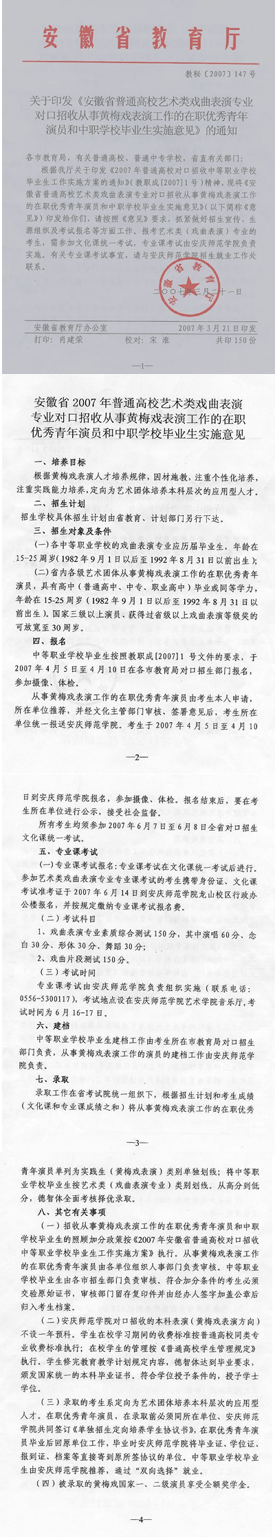 3、安庆师范学院2007年本科表演(黄梅戏表演方向)专业对口招生简章