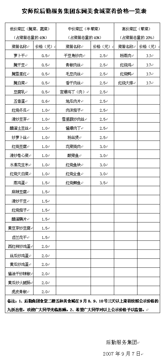 为给广大同学提供物美价廉的餐饮服务,最大限度的让利给各位同学。后勤服务集团和东园宾馆美食城共同研究协商,对部分菜肴价格予以调整。现将菜肴价格表公布如下: