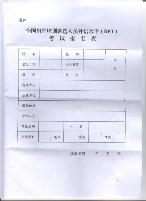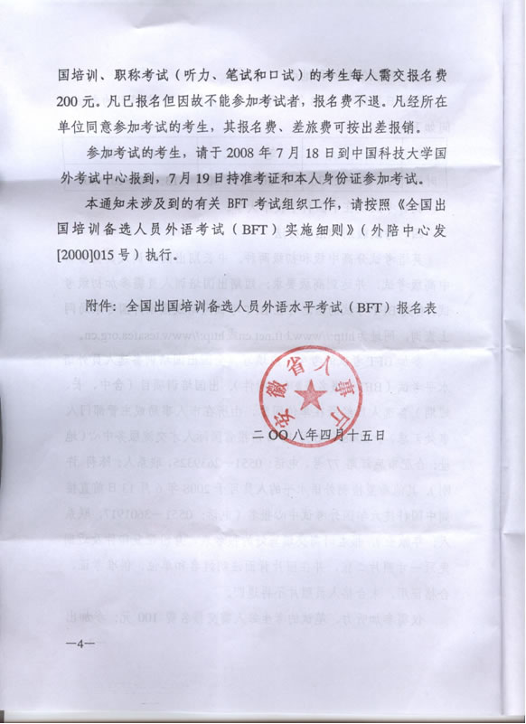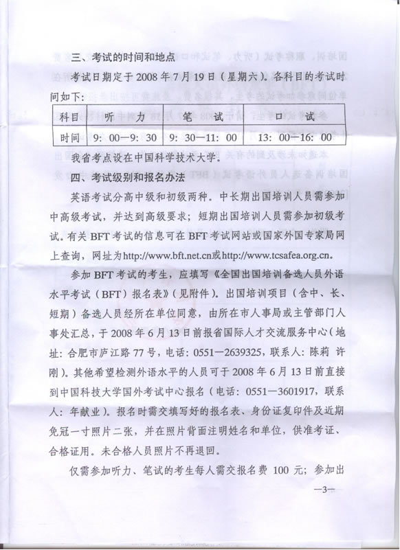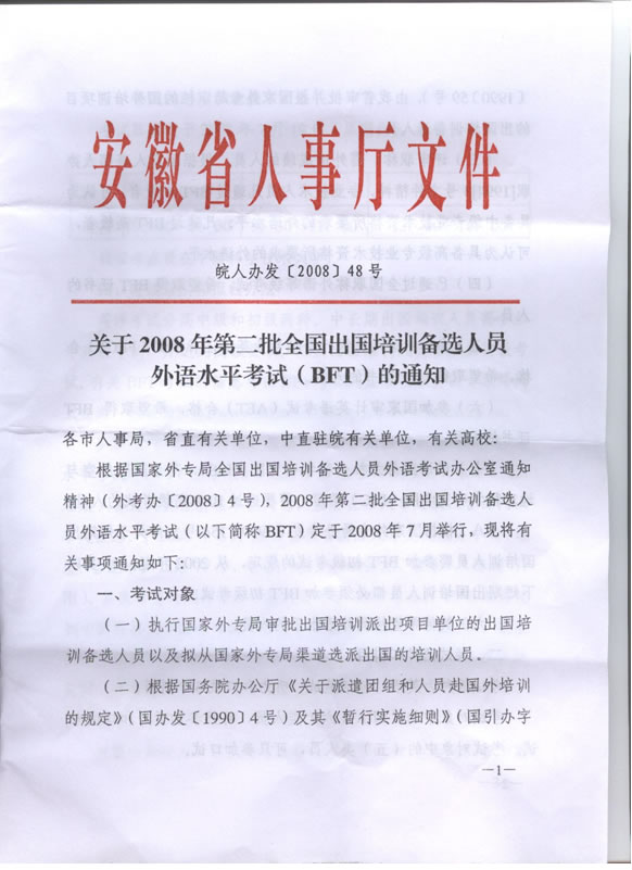 现将皖人办发〔2008〕48号文件《关于2008年第二批全国出国培训备选人员外语水平考试(BFT)的通知》转发给你们。根据此文件精神,BFT外语水平考试既可作为出国备选人员的外语水平考试,又可作为职称评审的外语水平考试。请传达到全体教职工,凡愿意参加此项考试的教职工,可填写《报名表》,于2008年5月23日前送交人事处(地点:行政楼南420室;联系人:王婷)。