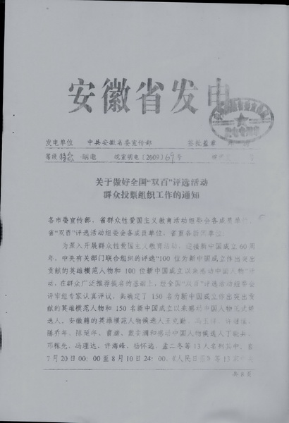 为深入开展群众性爱国主义活动、迎接新中国成立60周年,中央有关部门联合组织开展评选“100位为新中国成立作出突出贡献的英雄模范人物和100位新中国成立以来感动中国人物”活动。经评审组认真评议和组委会审定,现已确定了150名“为新中国成立作出突出贡献的英雄模范人物”候选人和150名“新中国成立以来感动中国人物”候选人,并通过各大主流媒体公之于众。