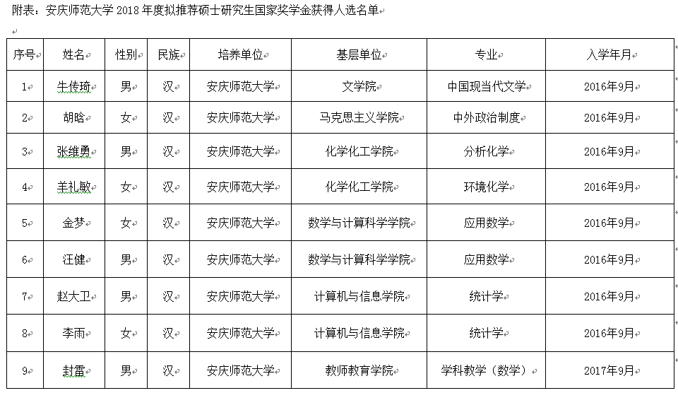 根据财政部教育部《关于印发研究生国家奖学金管理暂行办法的通知》(财教〔2012〕342号)、安徽省财政厅教育厅《关于印发安徽省研究生国家奖学金管理暂行办法的通知》(财教〔2012〕2507号)精神,以及《安庆师范学院研究生国家奖学金管理暂行办法》(院发〔2012〕18号)的相关规定,对照安徽省教育厅《关于2018年普通高校本专科生和研究生国家奖助学金评审及材料填报工作的通知》(皖教秘〔2018〕633号)文件要求,经研究生本人申请,研究生导师推荐,各一级学科硕士点2018年度研究生国家奖学金评审委员会审议报送,并经学校2018年度研究生国家奖助学金评审领导小组审议,拟推荐牛传琦等9名同学为beat365英国官方网站2018年度研究生国家奖学金获得人选。(具体名单见附表)