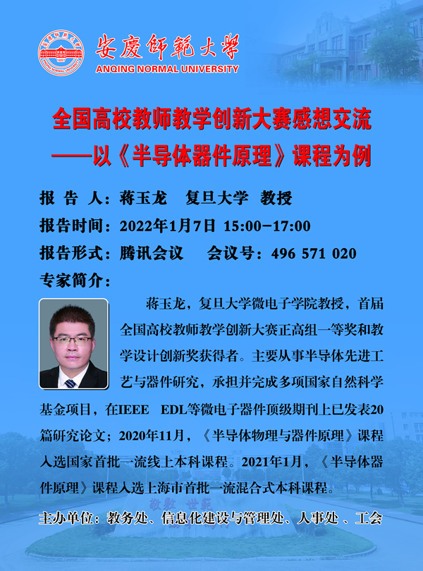 蒋玉龙,复旦大学微电子学院教授,首届全国高校教师教学创新大赛正高组一等奖和教学设计创新奖获得者。主要从事半导体先进工艺与器件研究,承担并完成多项国家自然科学基金项目,在IEEE EDL等微电子器件顶级期刊上已发表20篇研究论文;2020年11月,《半导体物理与器件原理》课程入选国家首批一流线上本科课程。2021年1月,《半导体器件原理》课程入选上海市首批一流混合式本科课程。