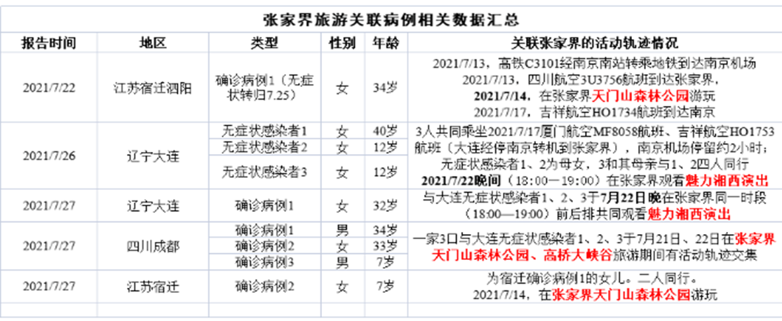 近期辽宁沈阳、大连,广东中山、珠海,四川成都、绵阳、泸州,江苏宿迁、扬州,以及我省马鞍山、芜湖等地相继报告确诊病例或无症状感染者。对部分省市确诊病例和无症状感染者活动轨迹进行分析发现,在7月14-22日期间有多例确诊病例和无症状感染者有张家界旅游活动史(见下表),在此期间同在张家界旅游的人群属于风险人群。当前疫情形势不容乐观,请广大师生员工予以重视。
