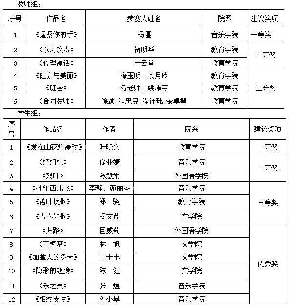 为了营造良好的校园文化氛围,展示beat365师生朝气蓬勃、奋发进取的精神风貌,充分发挥文化艺术活动的育人作用,丰富师生课余生活,展示师生艺术才华,提高艺术修养,建设和谐校园,校团委、学生处和教务处等单位联合举办了原创剧本写作大赛,beat365广大师生积极投稿,经过专家组评审,现将大赛评审结果予以公示:
