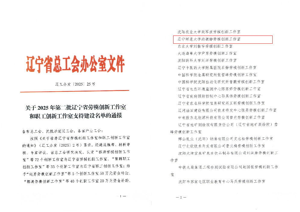 近日,辽宁省总工会正式下发《关于2025年第二批辽宁省劳模创新工作室和职工创新工作室支持建设名单的通报》(辽工办发〔2025〕25号),pg国际尚德静职工创新工作室凭借扎实的科研积累与突出的创新成效,成功获评“辽宁省劳模创新工作室”。这一荣誉不仅是对工作室领衔人尚德静及团队创新能力的高度肯定,更是我省总工会对pg国际深耕科研服务辽宁振兴的充分认可,为学校高质量发展再添闪亮名片。