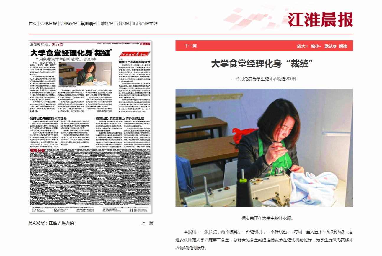 今年3月中上旬,杨友弟和食堂其他工作人员一起创办了beat365英国官方网站衣物便利站,为学校学生提供免费修补衣物和熨烫服务。考虑到对衣物缝补技术的要求,食堂本想聘请一名专业裁缝来为学生服务,但杨友弟力荐了自己。原来,今年43岁的杨友弟,曾是裁缝店的一名资深员工。1999年,她到上海的裁缝店学徒,经过9年练习,成长为一名私人定制服装设计师。但随着女儿的出生,她最终选择了带孩子返回老家安庆,全身心投入到对女儿的照顾中。