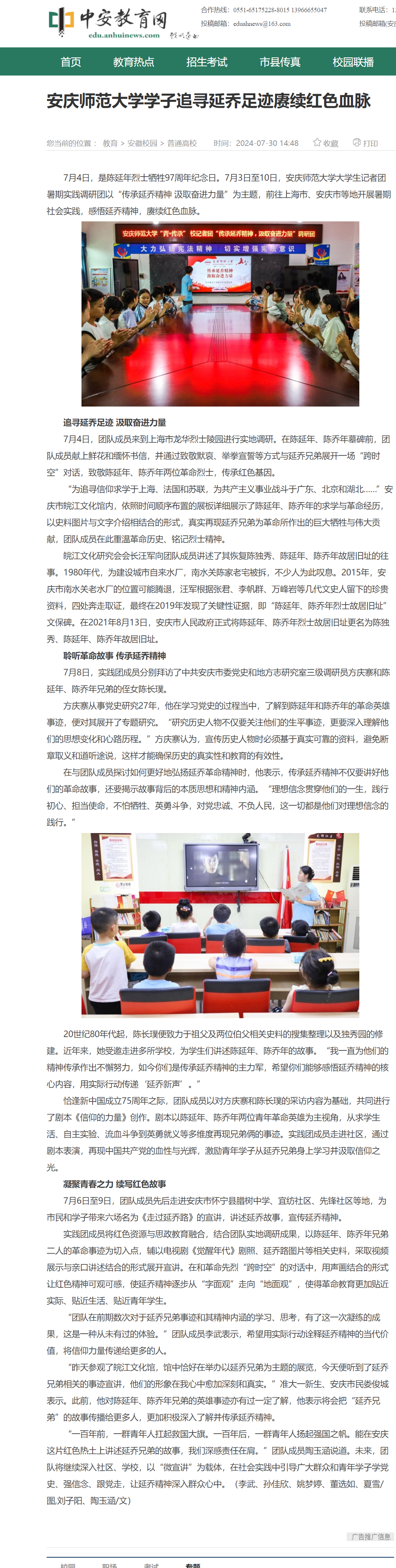 上一篇:安徽新闻网:追寻延乔足迹 赓续红色血脉 安庆师大学子开展暑期社会实践活动