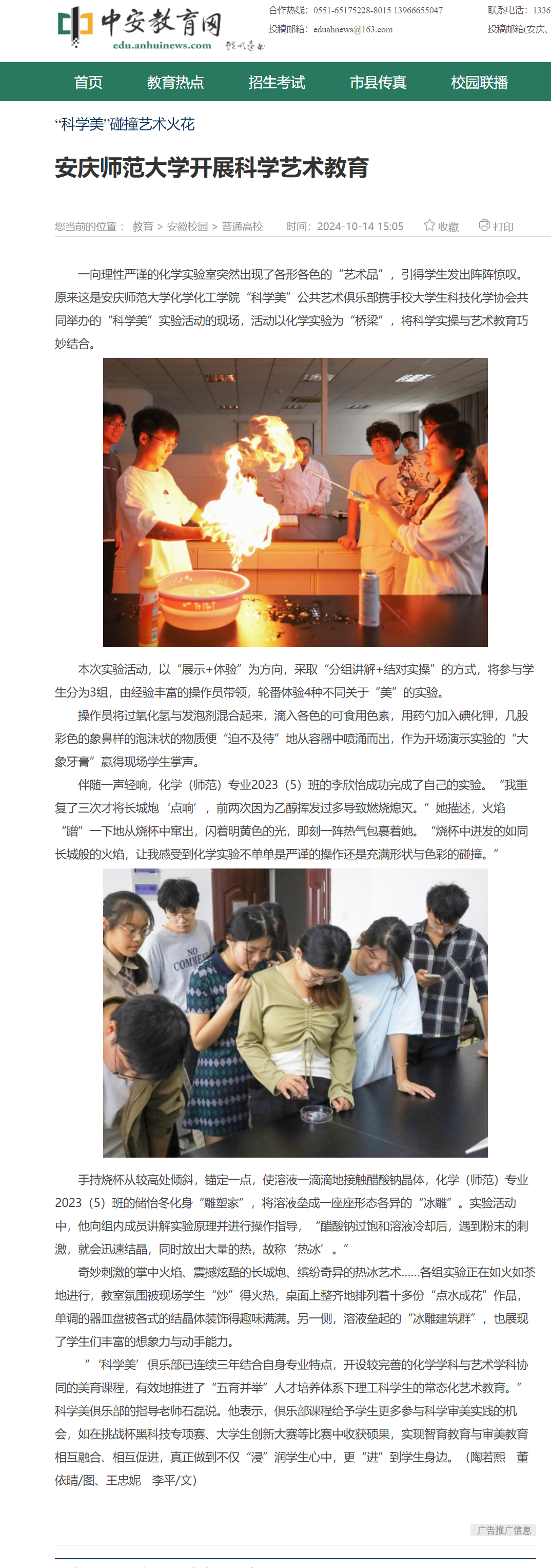 上一篇:安徽新闻网:科学美”碰撞艺术火花 安庆师大开展科学艺术教育