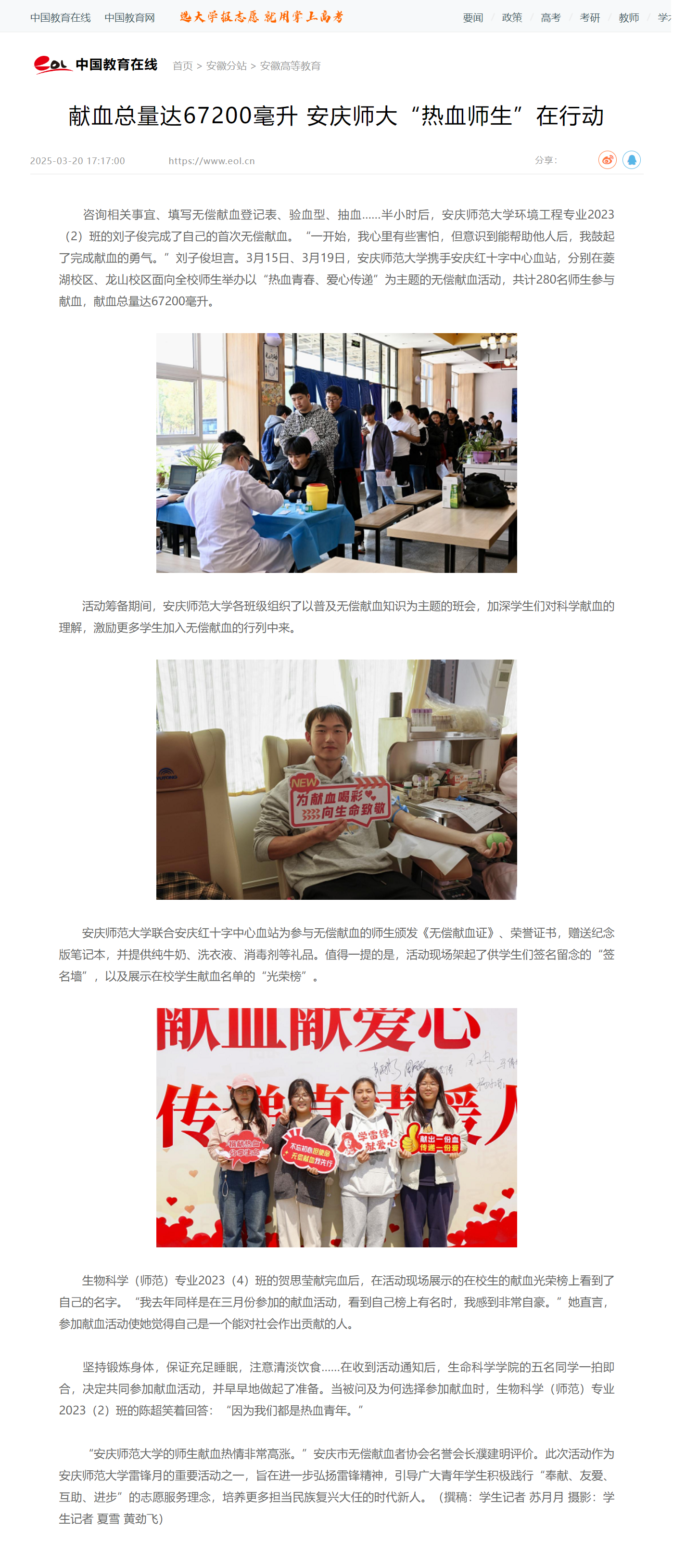 上一篇:安徽新闻网:献血总量达67200毫升 安庆师大“热血师生”在行动
