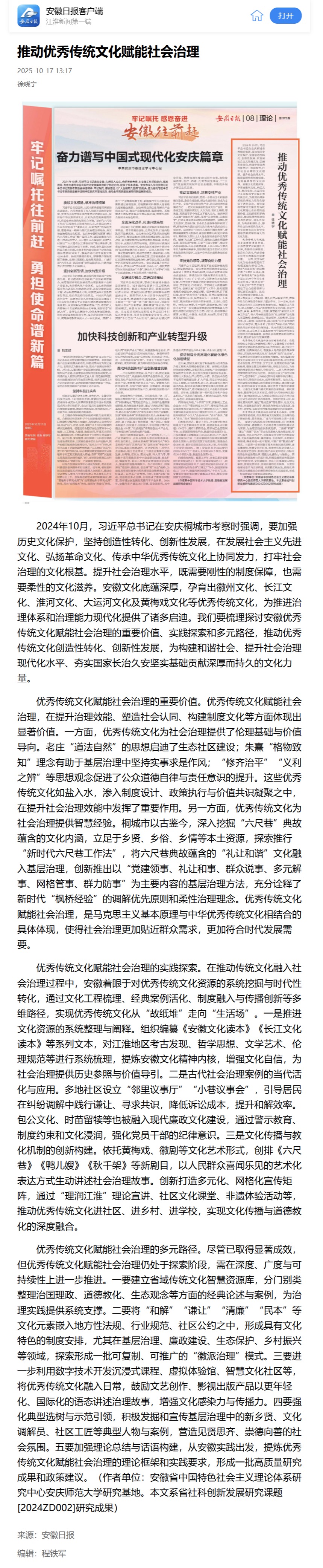 【安徽日报】推动优秀传统文化赋能社会治理https://app.ahnews.com.cn/displayTemplate/news/newsDetail/312/1578521.html?isShare=true