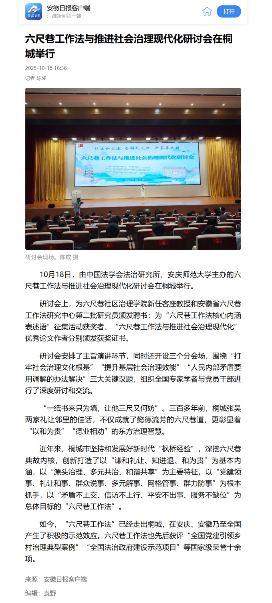 【安徽日报】六尺巷工作法与推进社会治理现代化研讨会在桐城举行https://app.ahnews.com.cn/displayTemplate/news/newsDetail/325/1579206.html?isShare=true