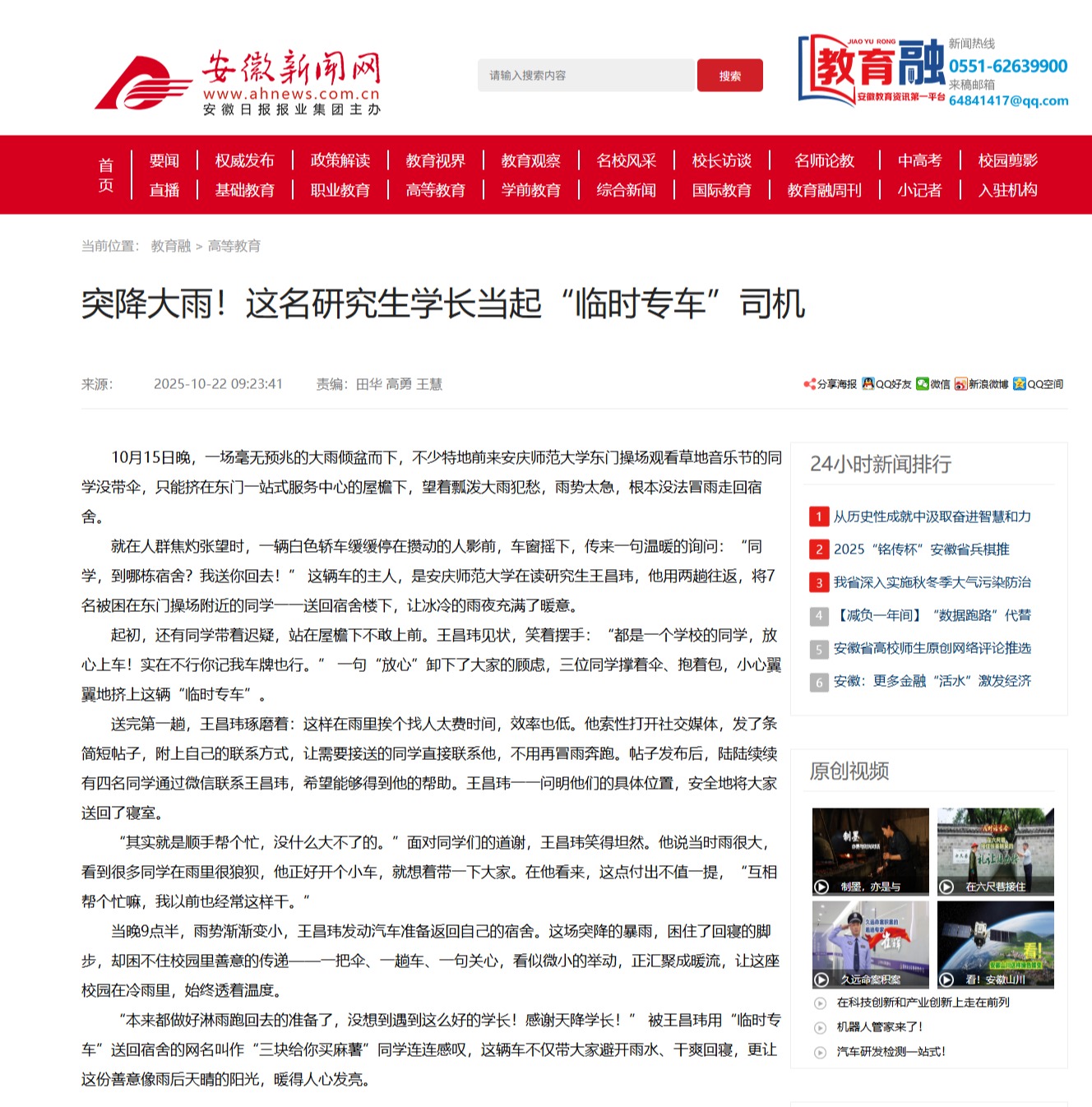 【安徽新闻网】突降大雨!这名研究生学长当起“临时专车”司机http://xxt.ahnews.com.cn/news/2025/10/22/c_41408.htm