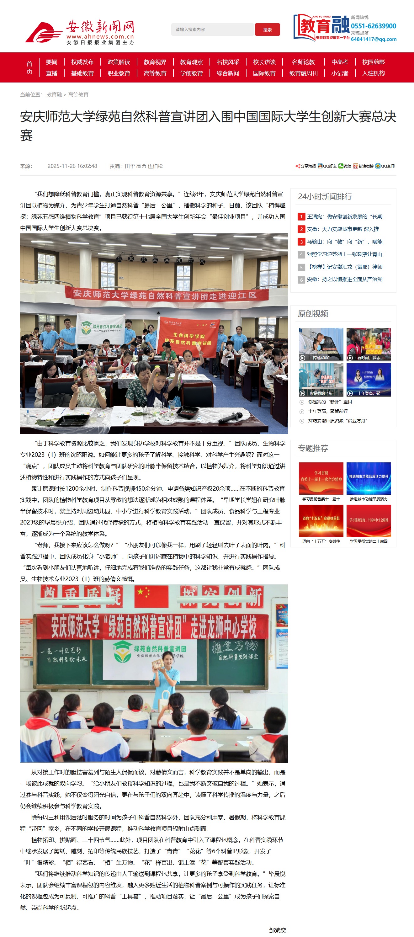 【安徽新闻网】beat365英国官方网站绿苑自然科普宣讲团入围中国国际大学生创新大赛总决赛http://xxt.ahnews.com.cn/news/2025/11/26/c_42743.htm
