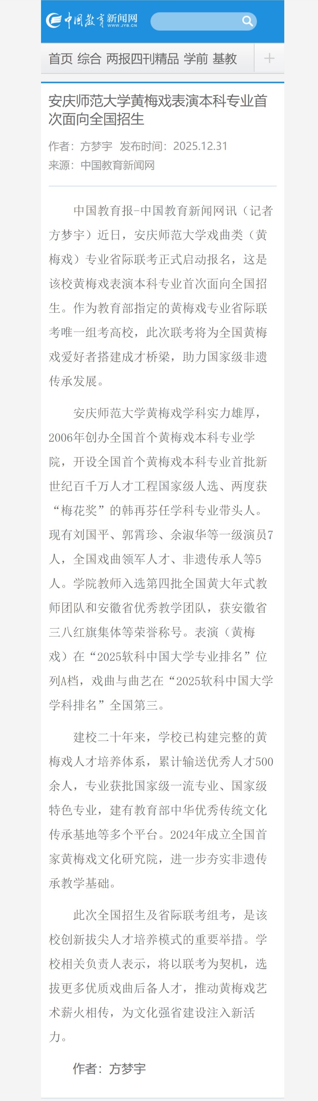 【中国教育新闻网】beat365英国官方网站黄梅戏表演本科专业首次面向全国招生http://m.jyb.cn/rmtzcg/xwy/wzxw/202512/t20251231_2111432618_wap.html