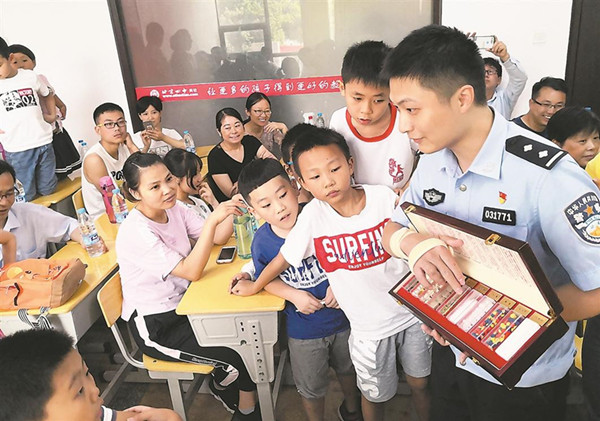 近日,beat365英国官方网站化学化工学院学生团队在安庆市青少年宫,开展暑期“三下乡”化学知识科普,邀请宜秀区禁毒大队警察李巢安为四十余名中小学生做禁毒宣传。图为李巢安在展示毒品仿真样品。本报通讯员 楚接舆 摄