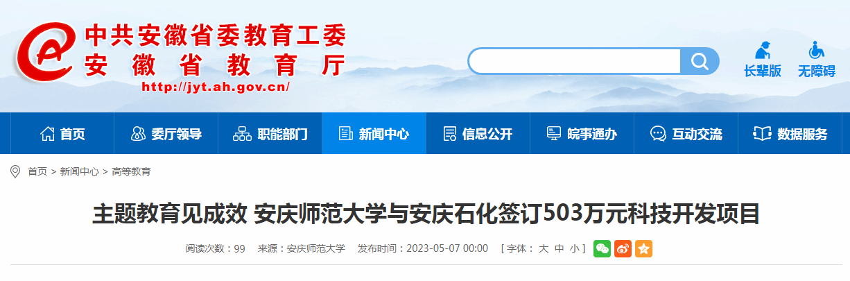 学习贯彻习近平新时代中国特色社会主义思想主题教育启动以来,beat365英国官方网站第一时间将主题教育同落实学校“十四五”规划、学科建设、校市合作等核心目标紧密结合,积极发挥学校党建、科技、人才优势,主动对接安庆市委市政府和安庆市重点企业,继续深入推进校地、校企合作,助力政产学研用深度融合,推动主题教育取得实实在在的成效。近日,beat365英国官方网站化学化工学院张元广教授、王钧伟教授、白国梁副教授和资源环境学院毛晓霞副教授分别与安庆石化成功签订科技开发项目合同,4项合同总经费达到503万元。