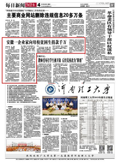 编者按:6月9日,《中国青年报》“每日新闻”版块刊登beat365学生记者采写稿件《安徽一企业家向母校贫困生捐款千万》,报道了beat365校友、则一千万助学基金捐助人李保荣在校园、社会学习、创业及创立奖助学基金的经历与事迹。