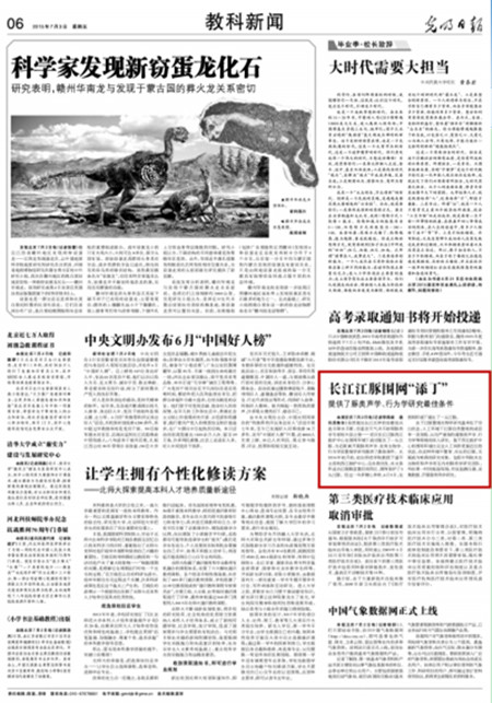 编者按:7月3日,《光明日报》“教科新闻”版块刊登宣传部陈东老师采写文章《长江江豚围网“添丁”》,报道了安庆师范学院于道平教授主持的江豚西江救护中心采用围网方式成功诞生江豚的新闻。