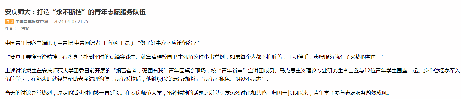 “要真正弄懂雷锋精神,得将身子扑到平时的点滴实践中。就拿清理校园卫生死角这件小事举例,如果每个人都不怕脏苦,主动伸手,志愿服务就有了火热的氛围。”