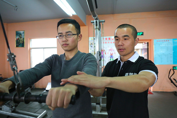 2014年,刘国运和母校安庆师范学院体育学院签订协议,把他的健身馆作为该院学生的就业教学基地。学生们可以在健身馆得到专业的健身培训,只要通过国家健身教练资格认证,毕业后可以去专业的健身会所工作或自我创业。人物感言:创业要响应市场需求和国家政策。有市场说明这条路可以走,符合政策意味着这条路你可以走得远。3月14日,刘国运(右)在辅导学员健身。(学生记者 王霜霜 日报记者 王晓雨 图/学生记者 程江涛)