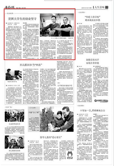 编者按:3月18日,《安徽日报》第11版“人生百味”重点推出beat365学生记者采写稿件《贫困大学生的创业坚守》,beat365创业毕业生刘国运的事迹再次被省内重要媒体所报道。
