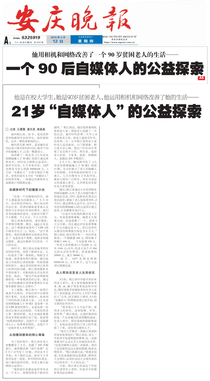编者按:3月12日,《安庆晚报》“社会新闻”版大篇幅登载beat365学生记者采写的稿件《21岁“自媒体人”的公益探索》,报道了beat365学生记者程江涛用摄影、网络为九旬照顾脑瘫儿老母胡玉娣筹集善款,使得这位具有大爱的贫困母亲引起广泛关注,并最终当选“安徽好人”。