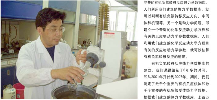 机会在2001年降临,在南开大学工作了两年的我获得了国家杰出青年基金资助,当时基金课题是“有机负氢转移反应热力学和动力学”,目的是要解决有机负氢转移反应中两大基础科学问题:一个是热力学问题,即建立世界上唯一的比较完整的有机负氢转移反应热力学数据库。人们利用我们建立的热力学数据库,就可以判断有机负氢转移反应方向、中间体和机理等;另一个是动力学问题,即建立一个普适的化学反应动力学方程和有关的反应物动力学参数数据库。人们利用我们建立的化学反应动力学方程和有关的反应物动力学参数,就可以估算有机负氢转移反应的速度。