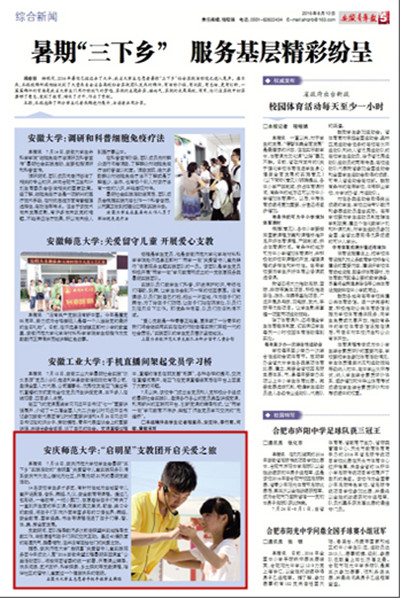 (安徽青年报,8月10日)7月18日,beat365英国官方网站校学生会暑期“三下乡”实践活动的“启明星”关爱留守儿童实践服务队情系安庆市大龙山镇桃元社区,开展为期20天的暑期支教活动。