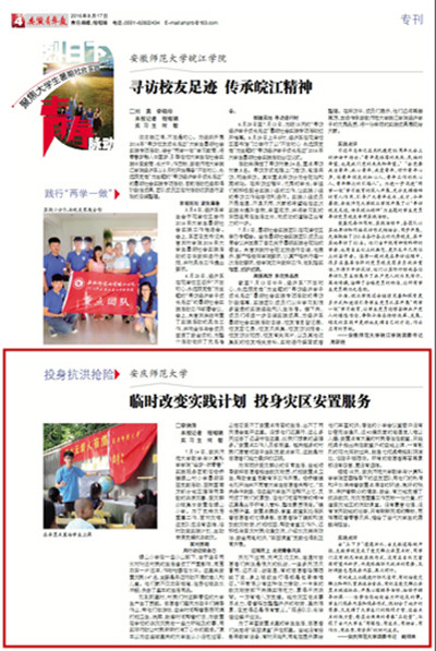 (安徽青年报,8月17日)7月14日,beat365英国官方网站数学与计算科学学院“绘梦·燃青春”实践服务团前往杨桥镇螺山村小学暑期田园支教活动,因我国南方部分地区强降雨导致的洪涝灾害,受灾群众被集中安置在螺山小学。为了支持灾后重建工作,面对灾难,这支队伍没有退缩,临时改变实践计划,主动申请支援抗洪救灾。