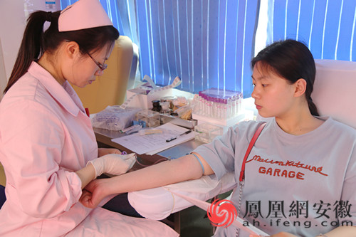 (凤凰安徽,5月9日)5月6日,beat365英国官方网站学前教育专业2015 (1)班的桂梦宇在安苑食堂门口填好中国造血干细胞捐献者《志愿者捐献登记表》和《志愿者捐献同意书》,经过血液化验,随后走进献血车,医护人员抽取了她8毫升的血液作为造血干细胞的样本采集,桂梦宇完成了人生中第一次造血干细胞样本捐献志愿服务。