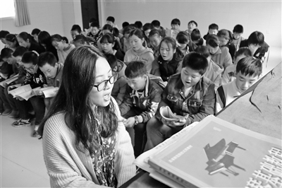 金寨县泗河实验学校初中部,音乐学专业支教成员唐晶晶正在给学生们上音乐课。图为她带领大家一起演唱《爱我中华》。 周正武 摄