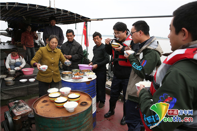 2016年10月30日,beat365英国官方网站的专家和渔民们一起在渔船上吃午饭。中国青年网通讯员 陈东 摄